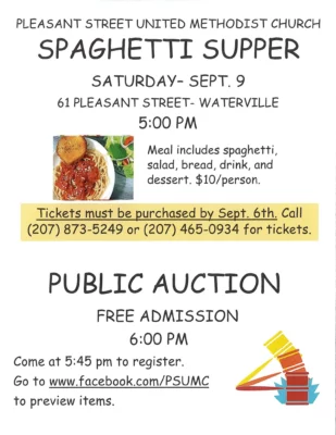 Pleasant Street United Methodist Church 61 Pleasant St #1, WatervilleMeal includes spaghetti, salad, bread, drink, and dessert. $10/person. Tickets must be purchased by Sept. 6th. Call (207) ... Read More